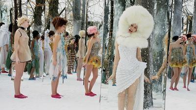 There are also many beautiful delicious images. While I don’t know about the snow, the picture above is from a scene set in a real forest adorned with strategically placed mirrors. Imagine it with just a few people and no goofy costumes.